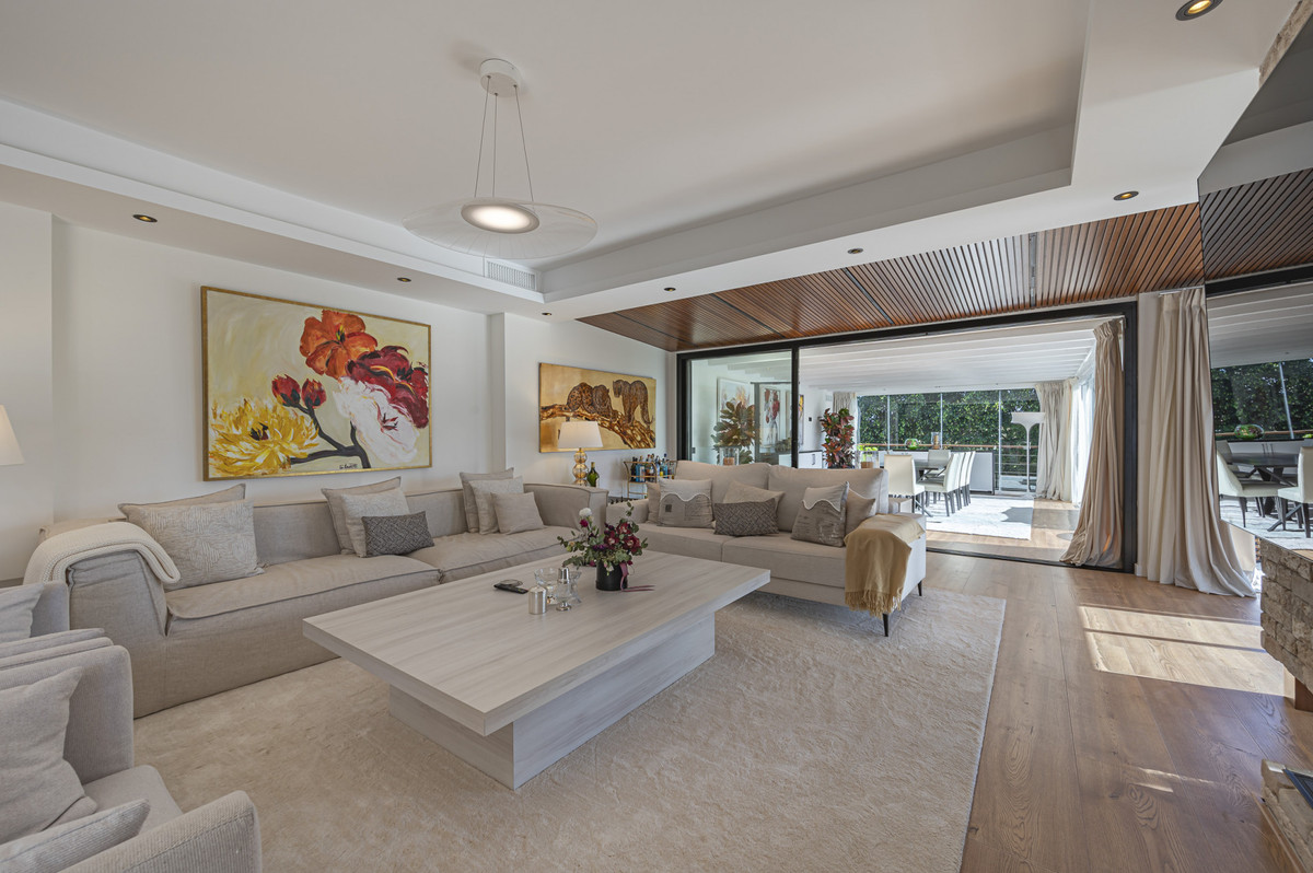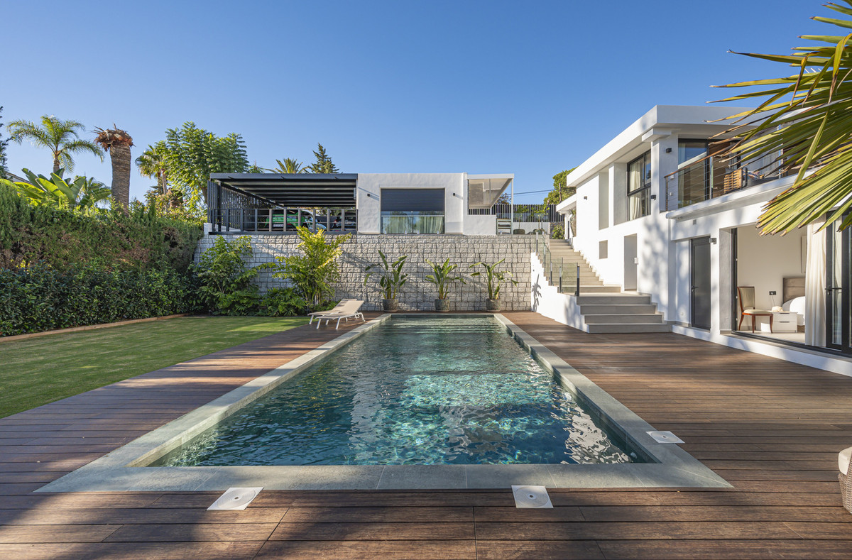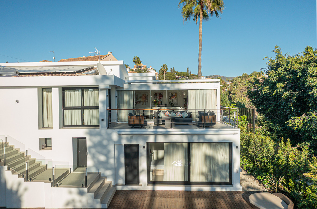 Presenting an exceptional villa in the sought-after El Rosario Urbanization on the esteemed Costa del Sol. This meticulously renovated property epitomizes luxury and stands as one of the premier residential areas on the eastern side of Marbella. Nestled in an enclave of villas surrounded by lush gardens, this residence prioritizes serenity. The villa boasts nearly 310 m2 of living space on a 1,065 m2 plot, featuring a pool, solarium, terraces with a covered outdoor kitchen, garden areas, and a covered garage. The residence features underfloor heating and electricity from advanced photovoltaic systems. Calacatta Venato marble adorns the exterior, and oak doors with an Iroko finish add elegance. The open-plan living and dining area seamlessly connects to a kitchen with wooden floors, creating an expansive space. The upper floor showcases three bathrooms with marble flooring and three bedrooms, two en suite, with illuminable wardrobes. The smaller bedroom is repurposed as a fitness area, while the main bedroom boasts a terrace with fitness equipment. The Gaggenau-equipped kitchen features top-of-the-line appliances and fine Moblapa wood furniture. Two guest flats with private entrance offer additional space. The villa includes a climate-controlled wine cellar and a newly constructed guest house with pure luxury and splendid views. The outdoor kitchen is equipped with exclusive all-weather technology and high-end appliances.
