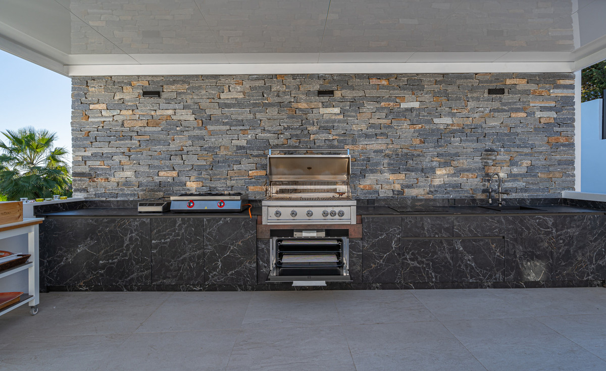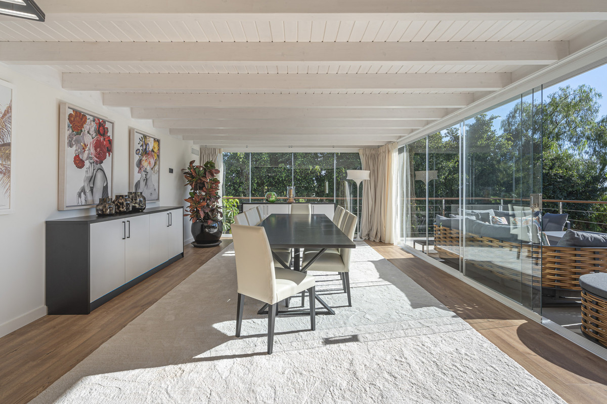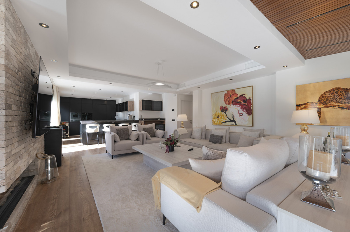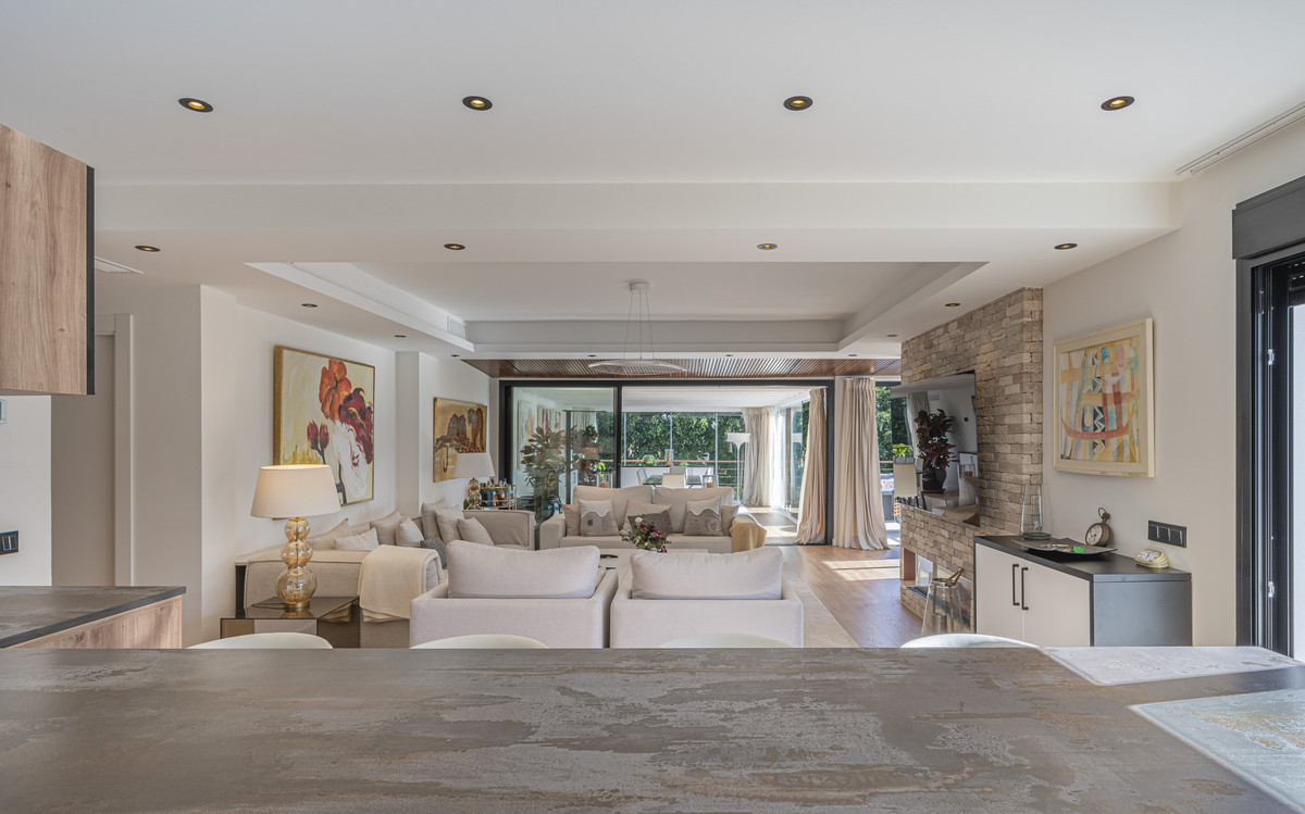 Presenting an exceptional villa in the sought-after El Rosario Urbanization on the esteemed Costa del Sol. This meticulously renovated property epitomizes luxury and stands as one of the premier residential areas on the eastern side of Marbella. Nestled in an enclave of villas surrounded by lush gardens, this residence prioritizes serenity. The villa boasts nearly 310 m2 of living space on a 1,065 m2 plot, featuring a pool, solarium, terraces with a covered outdoor kitchen, garden areas, and a covered garage. The residence features underfloor heating and electricity from advanced photovoltaic systems. Calacatta Venato marble adorns the exterior, and oak doors with an Iroko finish add elegance. The open-plan living and dining area seamlessly connects to a kitchen with wooden floors, creating an expansive space. The upper floor showcases three bathrooms with marble flooring and three bedrooms, two en suite, with illuminable wardrobes. The smaller bedroom is repurposed as a fitness area, while the main bedroom boasts a terrace with fitness equipment. The Gaggenau-equipped kitchen features top-of-the-line appliances and fine Moblapa wood furniture. Two guest flats with private entrance offer additional space. The villa includes a climate-controlled wine cellar and a newly constructed guest house with pure luxury and splendid views. The outdoor kitchen is equipped with exclusive all-weather technology and high-end appliances.