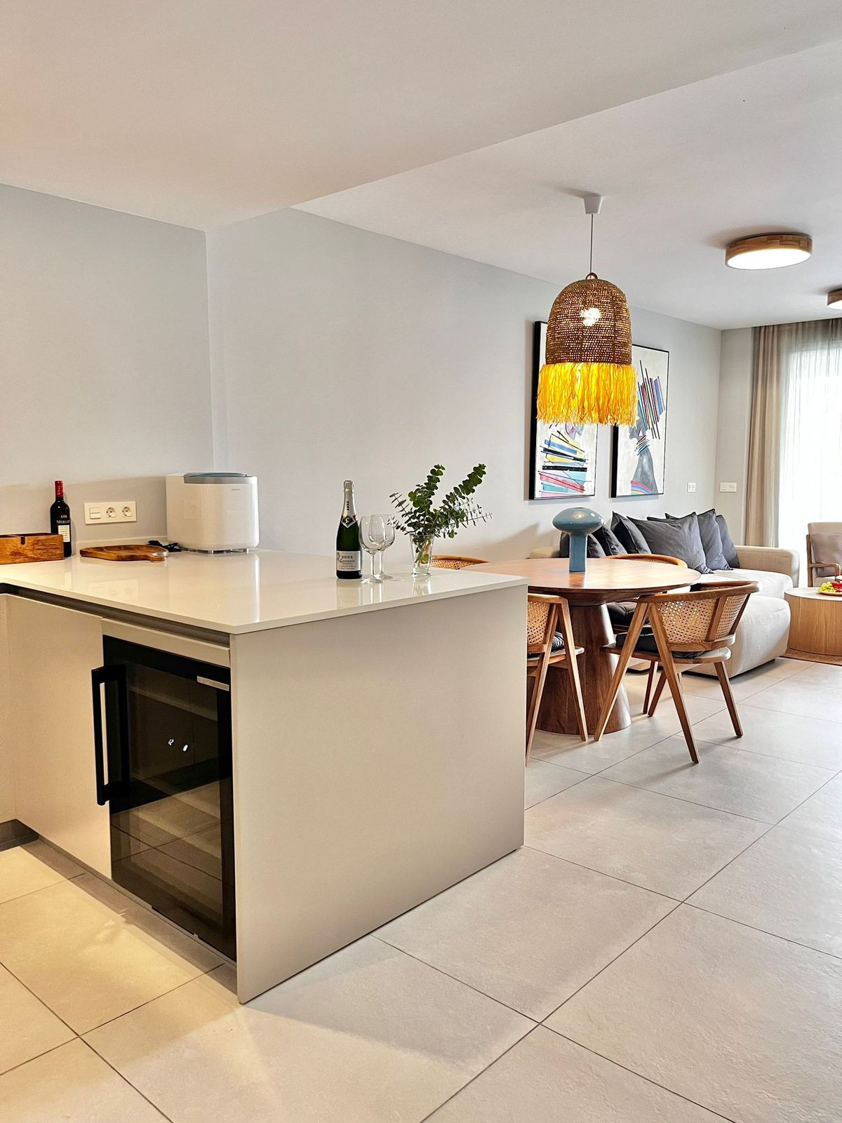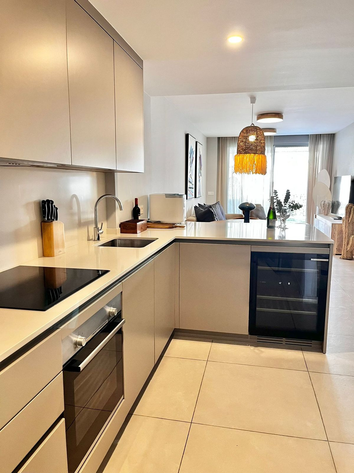 Beautiful ground floor apartment in a newly completed building ESTRELLA DEL MAR 200m from the most beautiful beach in Marbella and in the best location. Nearby restaurants on the beach such as Beach House, La Plage Casanis, La Scala. You can also walk to the famous Nikki Beach. Also within walking distance is the famous Centro Elviria Comercial where there are many shops, bars, restaurants and many others. The apartment is equipped with a living room with access to the terrace and garden with a dining room and an open fully equipped kitchen and utility room, where there is a washing machine and dryer. The master bedroom has a private bathroom with a bathtub and access to the terrace. The guest bedroom is equipped with two single beds. There is a separate bathroom with a shower for guests. All household appliances are under warranty like the entire building. In the underground garage there is a parking space and a storage room. By the common garden there is a swimming pool for adults and a paddling pool for small children. There is also a gym with basic exercise equipment. Must see!
