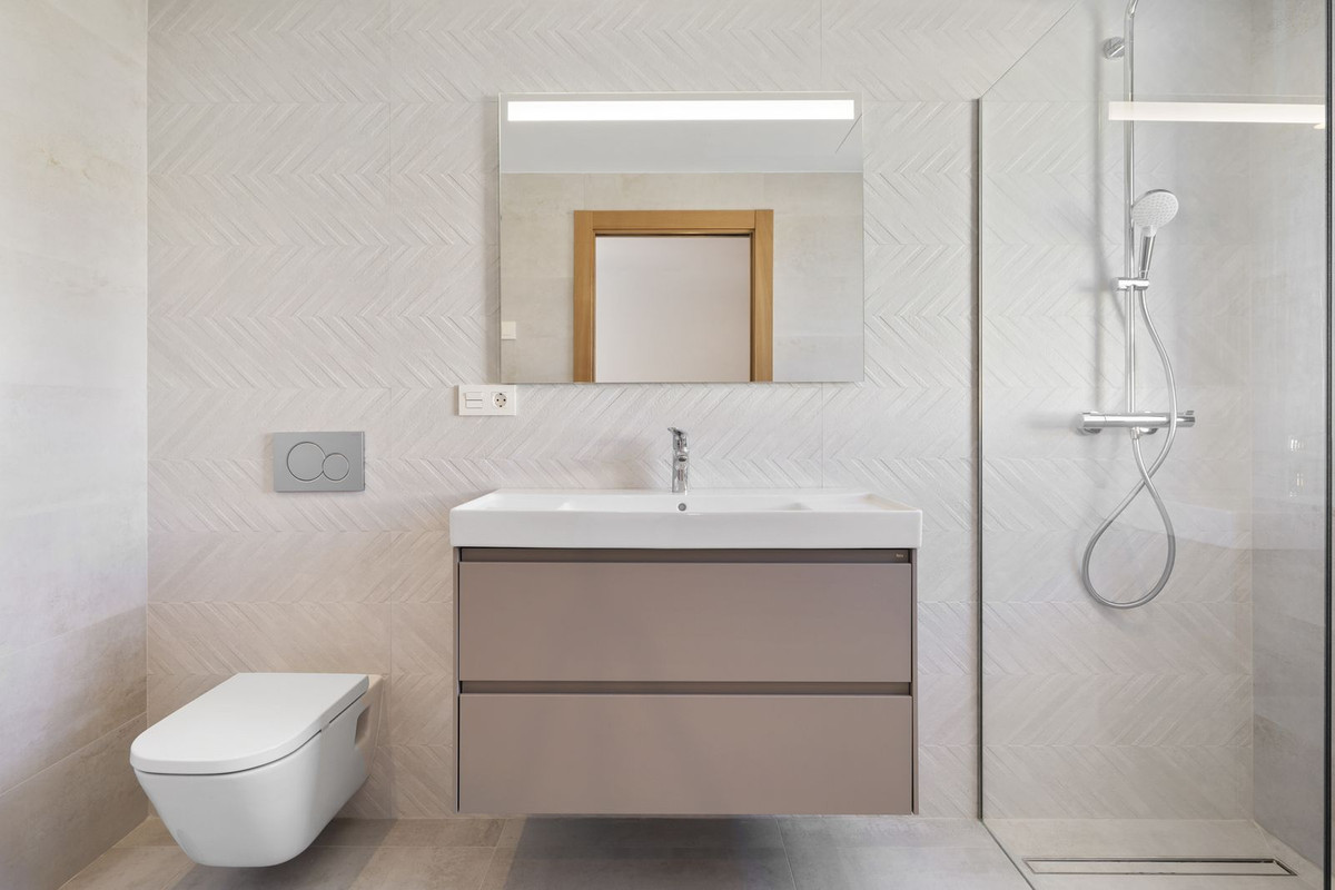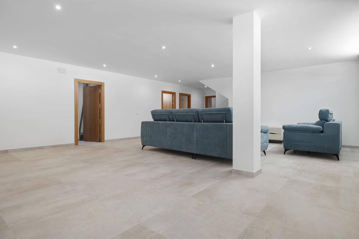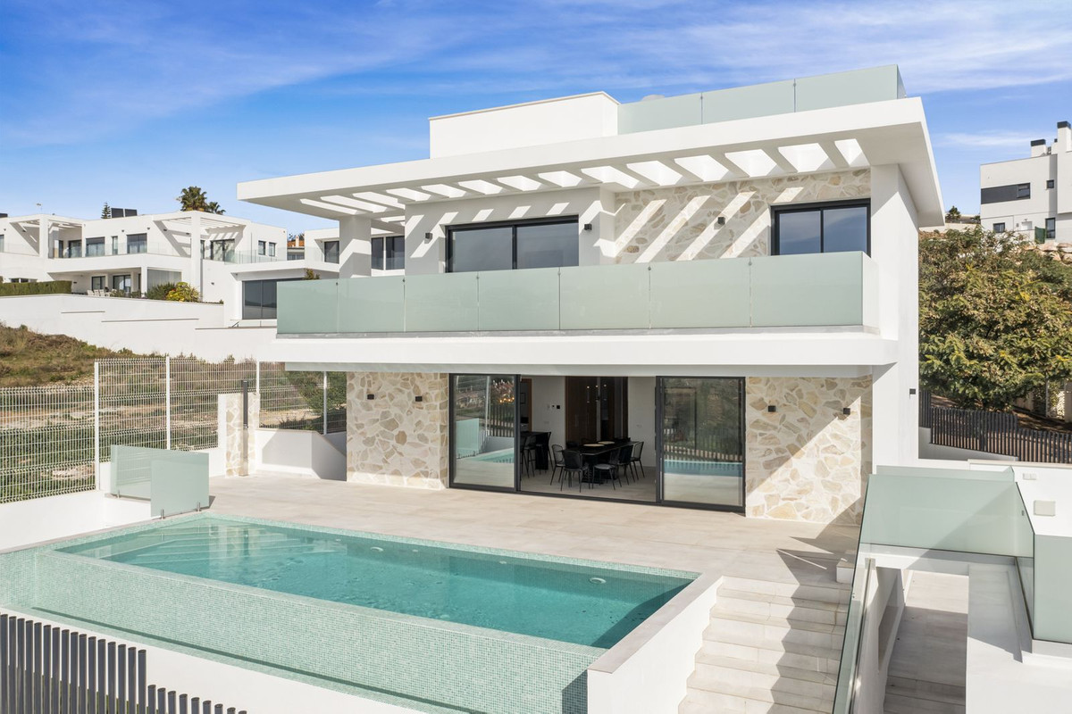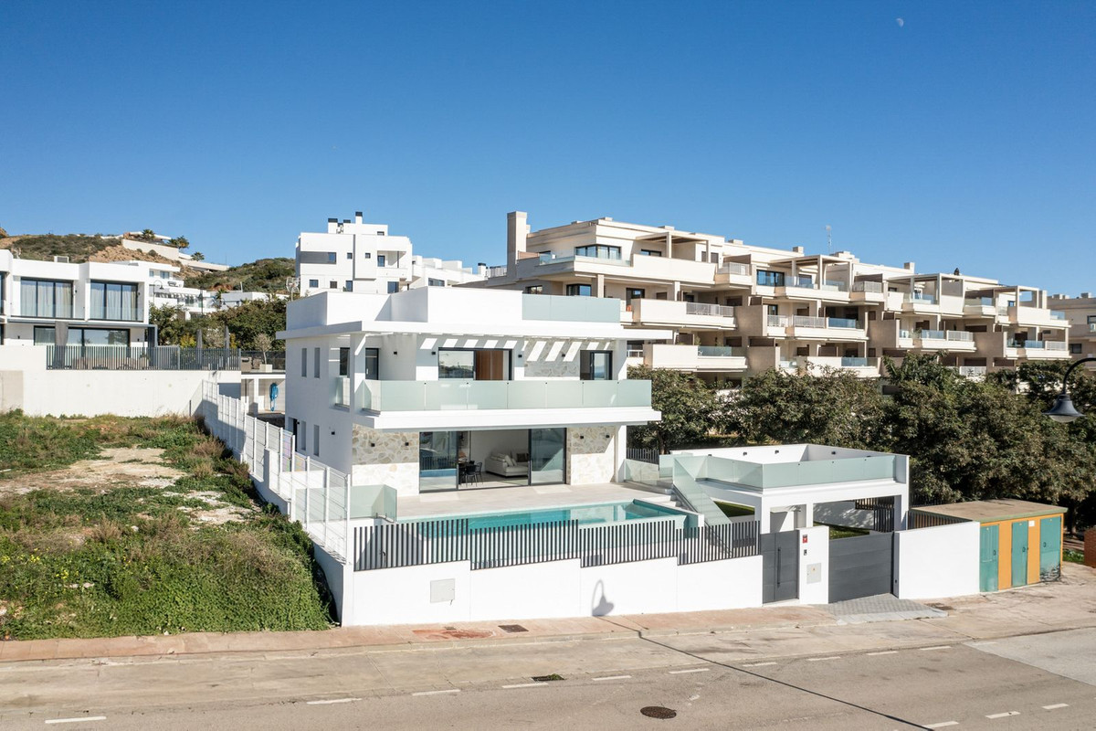 SPACIOUS CONTEMPORARY VILLA IN TOP LOCATION! This beautiful villa is located only a short walk from the center of La Cala de Mijas, a unique villa just newly built. With its 6 spacious bedrooms with fitted wardrobes and five luxurious bathrooms it is definitely an amazing property which you do not often find that close to the center of La Cala. Upon entering on the ground floor, you will find a beautiful spacious living room with a glass facade so that you have a lot of natural light. A beautiful open kitchen with spacious dining table makes this an area where you literally feel at home. The kitchen is equipped with all necessary built-in Bosch appliances. Next to the kitchen there is a storage room where the washing machine and dryer are, both Bosch as well. From the living room you can walk outside and you immediately have access to the swimming pool with an outdoor shower. Next to the swimming pool there is another 30m2 terrace. There are several electricity and water points on this terrace. From both the living room and the swimming pool you have an amazing view, on one side you will see the mountains and on the other side the ocean. On the same level you find a bedroom and bathroom, and the entire ground floor is equipped with underfloor heating. If you go upstairs, you will find three large bedrooms, all with beautiful fitted wardrobe and an en-suite bathrooms. The two bedrooms at the front of the house have sliding doors that open onto a terrace with once more beautiful views. Like the ground floor is also this floor equipped with underfloor heating. From the top floor you can go to the roof terrace, this exceptionally large terrace has a beautiful sea view. Unique is the basement of the house, because here you find two more bedrooms and a bathroom. And not just that, a huge relaxation area has also been created here, there is enough space to create a gym and a large television room for example. Outside you notice the beautifully landscaped garden that surrounds the house, in which many beautiful materials have been used and very high-quality artificial grass so that the garden is easy to maintain. There are many places around the house where you can relax in silence, completely privately. On the street side there is an entrance gate for the cars, there is room for three cars that can all be parked on private property. If you are looking for a modern, spacious villa close to La Cala center, then this is your chance! A visit is definitely worth it!!