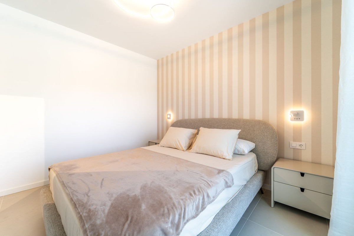 THE APARTMENT IS NOW RENTED FOR LONG TERM. IT CAN BE PURCHASED WITH THE CURRENT LEASE CONTRACT. Brand new east facing apartment, with 3 bedrooms, 2 bathrooms, spacious living-dining room, open plan kitchen fully furnished and equipped with electrical appliances, laundry area with washing machine, spacious terrace of 22m2 with mountain views and partial sea views. Master bedroom with walk-in closet and ensuite bathroom. Air conditioning hot and cold, built-in wardrobes in all bedrooms and living room, blinds in bedrooms and living room. Includes one parking space and storage room. Community area includes salt-water swimming pool, solarium and gymnasium.