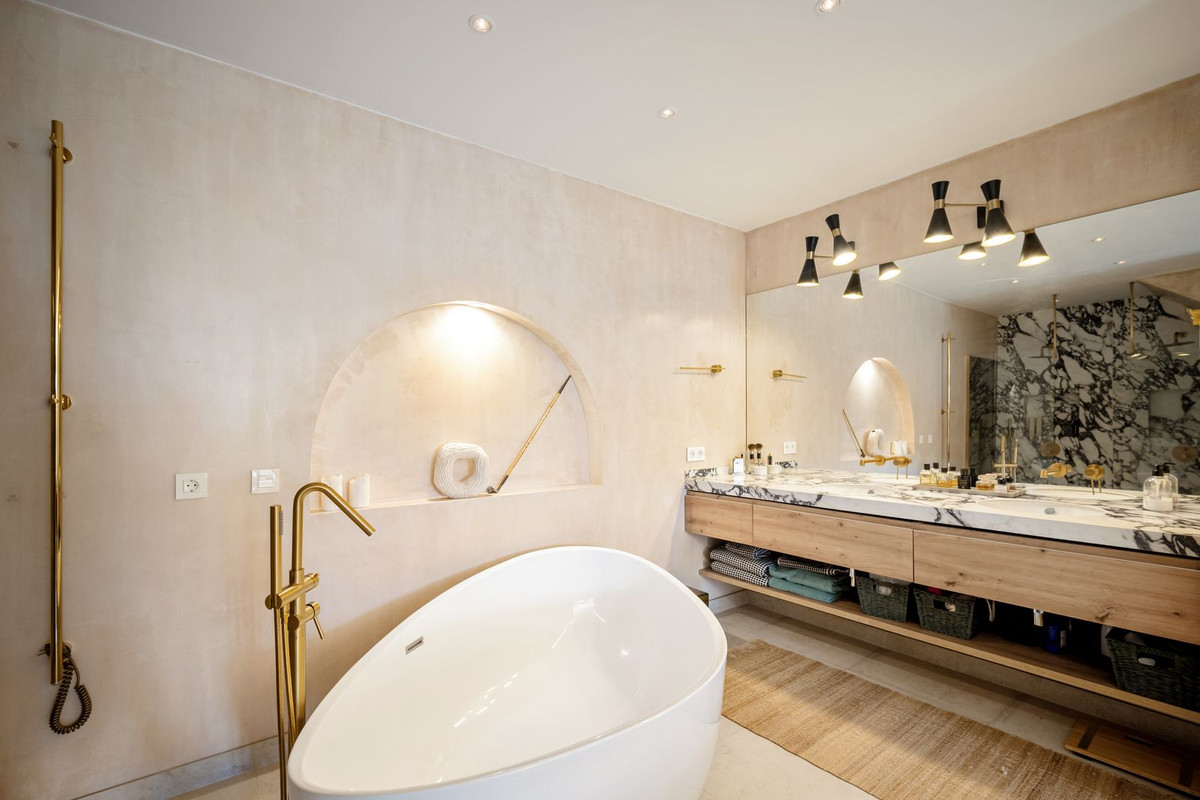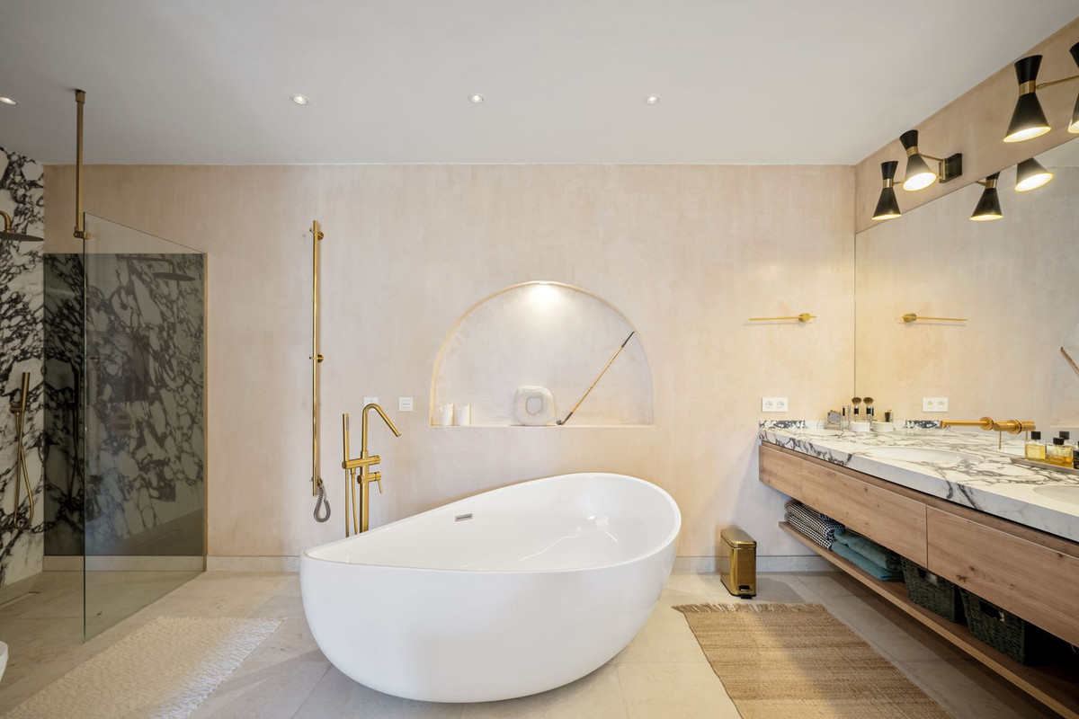 A Seamless Blend of Andalusian Heritage and Nordic Sophistication on the Golden Mile Nestled in the prestigious residential area of Marbella's Golden Mile, this beautifully newly renovated Andalusian-style townhouse seamlessly blends traditional architecture with contemporary Nordic interiors, offering a unique combination of charm, comfort and functionality. The property welcomes you through a cozy porch entrance, leading into a warm and inviting living room with a fireplace, a guest toilet and a modern open-plan kitchen with a spacious dining area. The entire main floor opens out to an expansive south-facing terrace featuring a dining area, built-in BBQ and views of the Mediterranean Sea—perfect for year-round entertaining. Upstairs, you'll find a bright bedroom with a private terrace boasting panoramic sea views, along with a full en-suite bathroom. On the lower level, a secondary living room with fireplace and TV area offers a cozy retreat, alongside a laundry room, a generous master bedroom with en-suite bathroom and dressing room, a children's bedroom and an additional bathroom. The basement level adds further value with a guest bedroom, a chill-out lounge, a bathroom and a private sauna, making it ideal for hosting guests or creating a wellness sanctuary. This area can easily be converted into a private garage. Located within a secure gated community, residents enjoy access to fantastic amenities including tennis and padel courts, as well as a swimming pool—perfect for relaxing or staying active. This tastefully styled home offers plenty of space across multiple levels, ideal for families or those seeking a home with character, comfort and versatility—just minutes from Marbella's beaches, international schools and all the amenities of the Golden Mile. To ensure high energy efficiency this house is using solar panels and has two electrical charger for EV-cars. Underfloor heating is installed throughout the house for extra comfort. This charming townhouse is perfectly located just a few min from the well renowned Swans school and 7 min from the famous Puente Romano beach resort with top quality restaurants and amenities. Come visit this house today and LET US MOVE YOU!