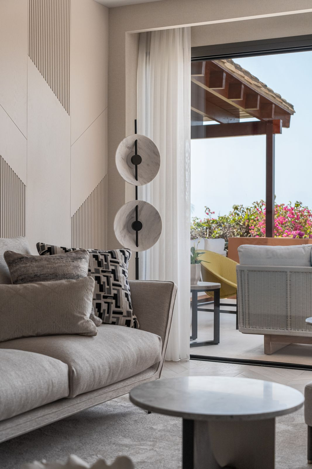 Artful 4-Bedroom Elevated Ground Floor Apartment with Panoramic Sea Views in Les Belvederes, La Cerquilla – Nueva Andalucía Located in the prestigious and picturesque urbanisation of Les Belvederes in La Cerquilla, Nueva Andalucía – also known as Marbella’s Golf Valley – this stunning, elevated ground-floor apartment offers a rare combination of elegant design, high-end finishes, and breathtaking views. Surrounded by some of the finest golf courses on the Costa del Sol, and just a short drive from Puerto Banús and Marbella’s golden beaches, the location is ideal for those seeking both tranquility and convenience. This beautifully renovated apartment spans a single level and features four generously sized bedrooms, all with tasteful ensuite bathrooms, as well as a separate guest toilet. Every detail has been thoughtfully considered and executed to the highest standards. The interior showcases a refined sense of style, blending timeless design with modern sophistication. The bespoke kitchen, crafted with premium materials, is fitted with state-of-the-art Gaggenau appliances, offering both functionality and sleek aesthetics. The open-plan layout flows effortlessly into the dining and living areas, creating a bright and welcoming ambiance. Natural oak wooden flooring runs throughout the property, complemented by high-end furnishings by Alexandra Collection and custom-designed finishes, including elegant Gessi taps and fixtures. A full domotic system (smart home technology) ensures comfort and control at your fingertips, allowing you to manage lighting, climate, and security from anywhere in the world. One of the apartment’s standout features is its expansive, sun-drenched terrace, offering panoramic views of the Mediterranean Sea and the surrounding lush landscapes. It’s the perfect setting for outdoor dining, relaxing, or entertaining guests year-round in the warm Costa del Sol climate. Residents of Les Belvederes enjoy exclusive access to a communal heated swimming pool, all set within beautifully maintained communal gardens as well as gym, sauna and private tenis courts. The gated community offers 24-hour security, providing peace of mind and a high level of privacy. This property is an ideal choice for families seeking an unforgettable holiday retreat or a permanent home in one of Marbella’s most desirable communities. With its unbeatable combination of location, views, and design, this apartment is a true gem in the heart of Nueva Andalucía.