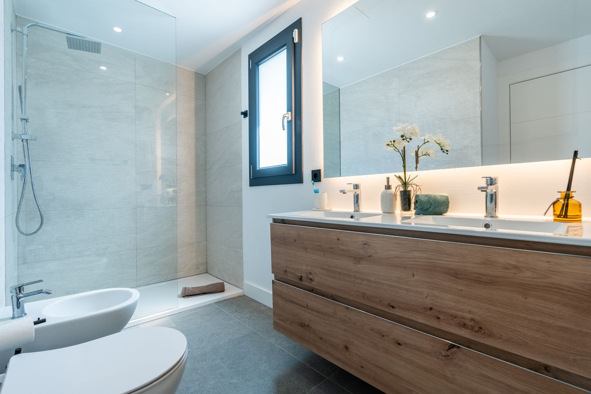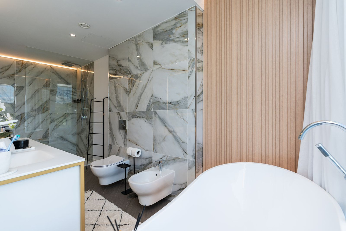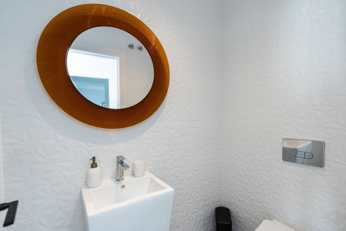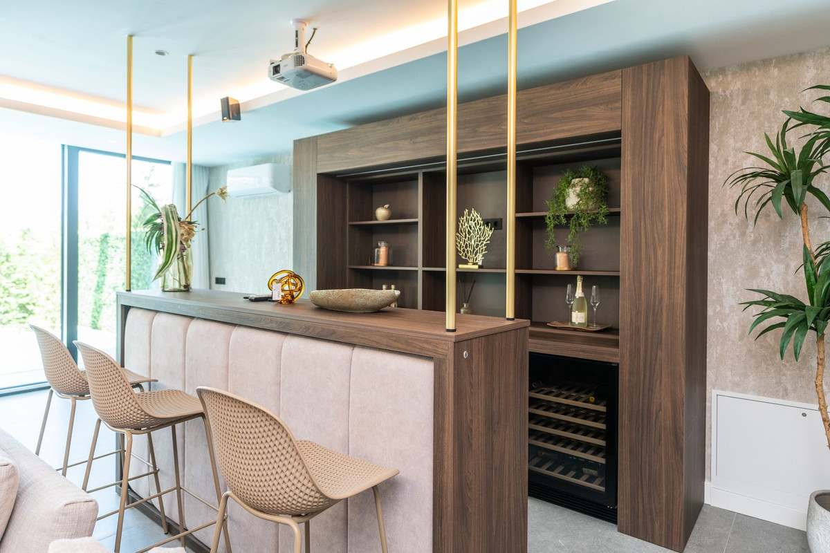 Fantastic luxury modern villa right in the heart of La Cala Resort. Here you have everything you ever asked for luminous, luxury , loveable, villa. Panoramic views from the Solarium whilst relaxing in the jacuzzi of the Golf, the undulated sourounding mountains, Countryside you can even o see down to the sea. Walk in the front door and to the left of the front door you have a really nice stairway with a feature chandlier over two floors. Here you have a fabulous open plan kitchen/sitting/dining room with floor to ceiling windows and a picture through each one. Also on this floor you have a double bedroom ensuite and also another downstairs toilet. The sitting room leads out to a covered terrace. Upstairs you will find two more double bedrooms ensuite and one with an ultar modern design and layout. From the landing here you have Access to the solarium. Downstairs you have a large basement which has been set up as a Cinema/Bar chill out area, another bedroom ensuite, utility room, two more small room which could be used as an office, store, even a Little bedroom. There is also a guest bathroom which can comes in handy as here you have direct access out to he garden and pool area. The house has a dougle parking places by the front door and set up to plug in your electric car. The Villa is in a Little gated complex known as "Elysium" which is in the heart of La Cala Golf so you have on your doorstep the 3, 18 hole courses known as Asia, Europe and America which were designed by Cabell Robinson, Golf Academy with small par 3 course, Hotel with Spa, and Restaurants, Club House with a beacutiful terrace overlooking the golf course ideal for eating "Al Fresco" Only 10 minutes to La Cala de Mijas an old fishermans village with a long Sandy beach and excellent Restaurants. La Cala is located only 10 mins drive to the centre of Fuengirola and 15 mins to the centre of Marbella, 40 mins to Malaga Airport. This villa is ideal to live in all year round or to use as a holiday home or even to buy as an investment with Good rental possibilities.