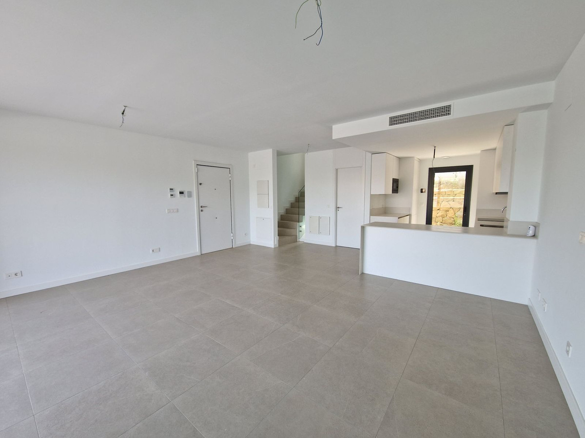 Brand new semi detached villa near Atalaya golf course and within easy reach of Atalaya golf club and El Paraiso golf club. The property faces west and has it's own private parking space within the private plot of the house. One enters a spacious living dining room with open plan kitchen and this whole area flows gently out to a large sunny terrace with views of the surrounding countryside. On this level there is a guest bathroom. Upstairs is the master bedroom with a bedroom ensuite and another bedroom which shares a terrace with the master bedroom. There is a third bedroom which shares a bathroom with the second bedroom. The whole house has underfloor heating and air-conditioning all run with aerotermia energy which is the 21st century form of ecological and cheap energy. The house has aluminium frame windows with double glazed glass and pocelanic floors. The community has a large communal swimming pool. Situated about 2 kms from restaurants and shops, 4 kms from the beach and about 6 kms from San Pedro de Alcantara. Easy access to Marbella town, Puerto Banus, Estepona and all the golf courses and the other amenities along the coast.