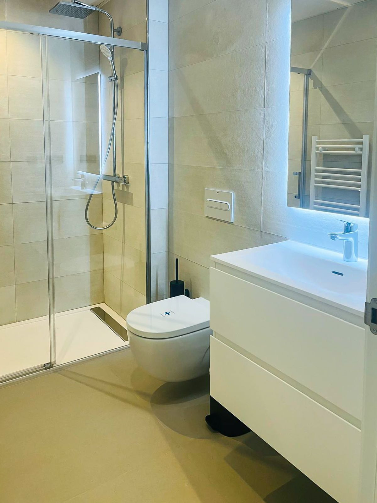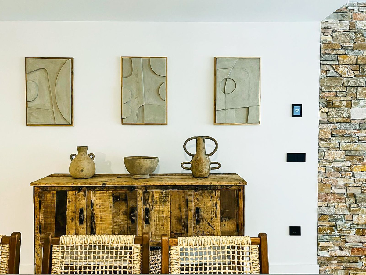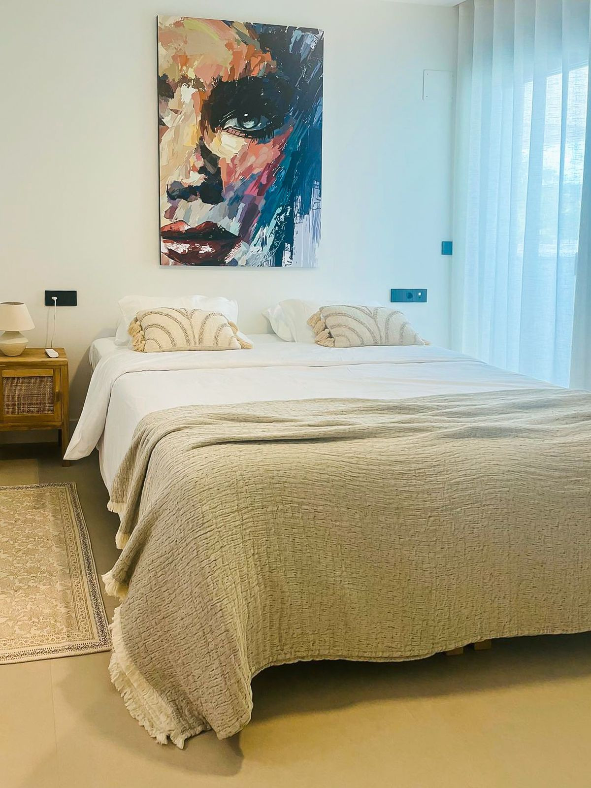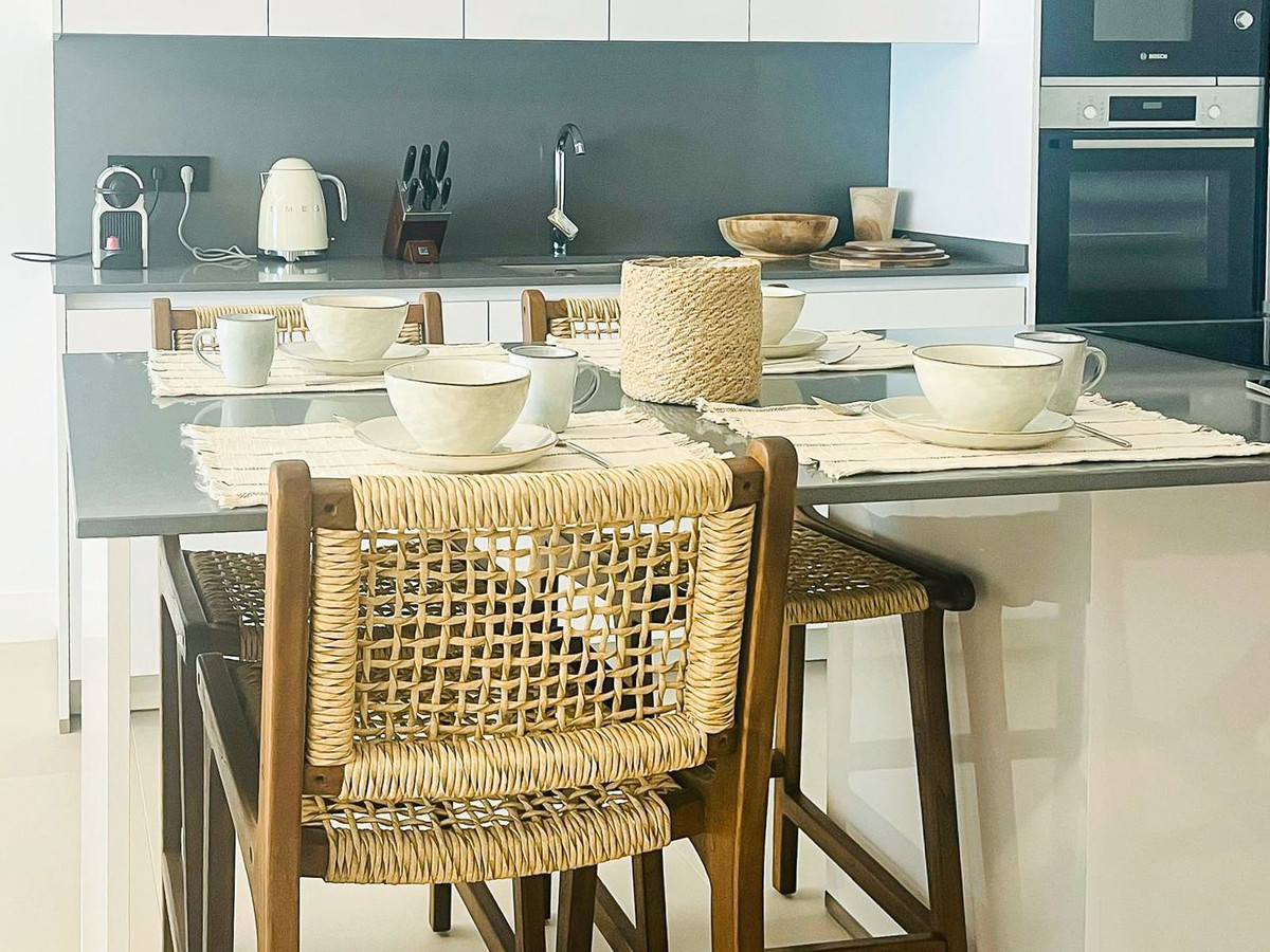Fantastic luxury apartment located in the centre of Estepona, the garden of the Costa del Sol. This newly build apartment is conveniently situated within walking distance of the marina of Estepona , close to the romantic and vibrant old town and only 15 minutes walk from the beach of La Rada. Offering 2 bedrooms and 2 bathrooms. The main bedroom has an open plan bathroom with walk-in shower, anti-fog mirrors, electric towel racks and extra wardrobes. A fully equipped and open plan kitchen with all Bosch appliances and spacious living dining area. Carefully decorated in a perfect blend of Scandinavian minimalism, boho accents and ethnic touches. But more than that, it is the ideal place for outdoor living as there is also an oversized covered terrace that has been recently upgraded with glass curtains for maximum use of the terrace all year round and a very nice mediterranean garden with very low maintenance. The terrace has water and electricity pre-installation for an outdoor kitchen. The garden has sprinkler installation for automatic watering of the plants as wel as pre-installation for a jacuzzi. The domotic system for home automation is also installed to control the lights and electric blinds. Air conditioning and floor heating are provided though aerothermal energy. Also good to know is that the extra spacious utility room with washing and tumble dryer is just across the front door. A private underground parking space is also included in the price. The exclusive gated community offers a large outdoor pool and state of the art gym facilities, community area, game room and secure entrance. Alexia Life stands out for its architecture and design but also for the great community and is a must see if you are looking for the perfect holiday house or for all year round living.