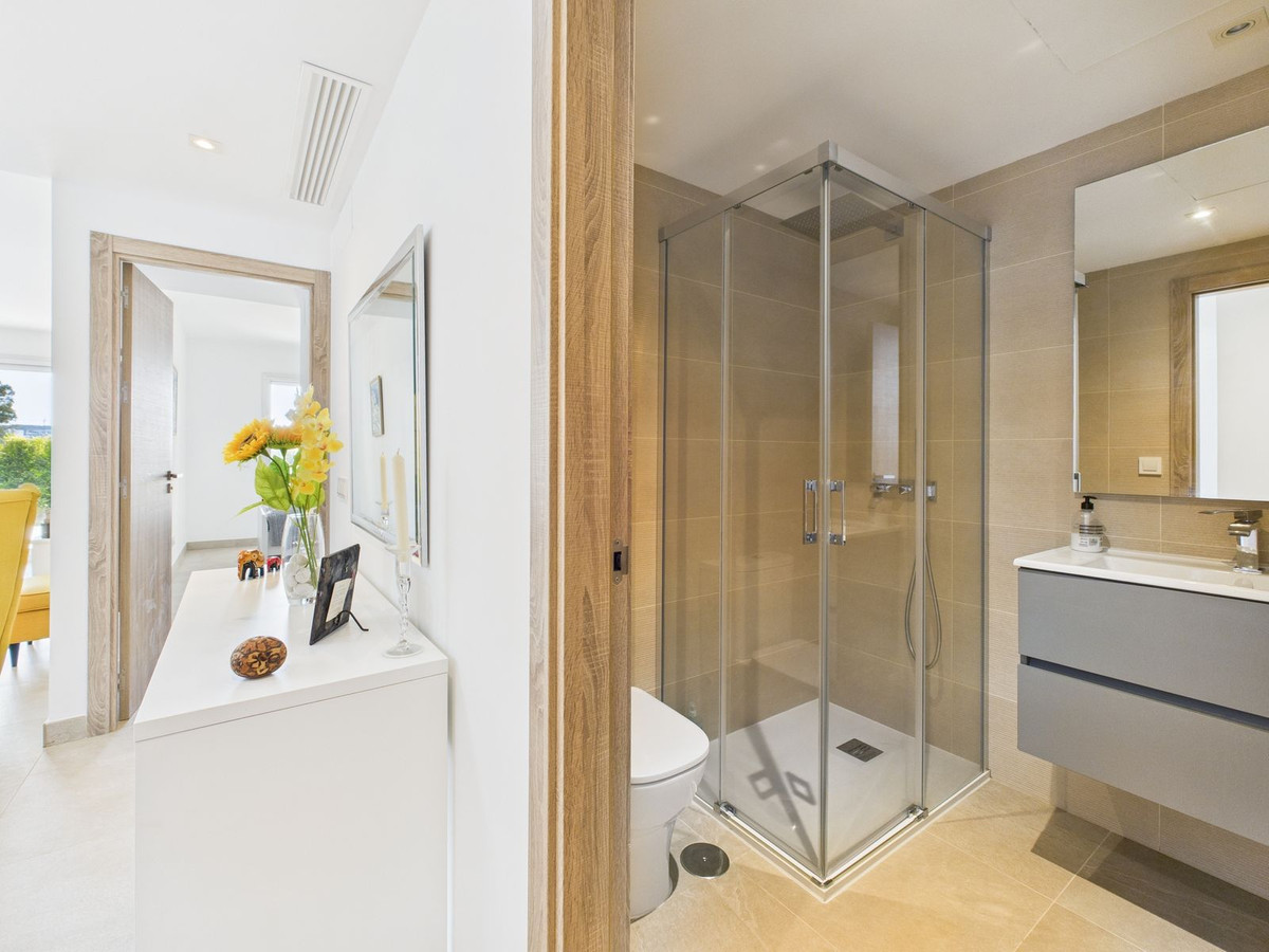 Modern 2-Bedroom Ground Floor Apartment – Sunny Golf, Estepona Located within the newly completed Sunny Golf development in Estepona, this 2-bedroom, 2-bathroom ground floor apartment combines contemporary design with the relaxed Andalusian lifestyle. Set in a secure gated community surrounded by golf courses and natural beauty, the property offers a peaceful yet well-connected location just a short drive from beaches, shops, and the vibrant heart of Estepona town. Completed in 2024, the apartment enjoys a bright and spacious open-plan layout, featuring a generous living and dining area that flows seamlessly onto a private terrace with garden and mountain views. With its southwest orientation, the property benefits from sunshine throughout the afternoon and spectacular sunsets over the surrounding hills. Key features include: 2 spacious bedrooms and 2 modern bathrooms Open-plan kitchen and living area with abundant natural light Private terrace ideal for outdoor dining and relaxation Communal swimming pool set within beautifully landscaped gardens overlooking the golf course Secure gated community with modern infrastructure and contemporary design Designated parking space included Perfect as a holiday home, permanent residence, or investment property, this stylish apartment offers all the comforts of modern living within a quiet and well-maintained community. With its desirable orientation, peaceful views, and brand-new construction, this property represents an excellent opportunity to enjoy modern Mediterranean living in one of Estepona’s most up-and-coming residential areas. Book a viewing now, keys are in office.