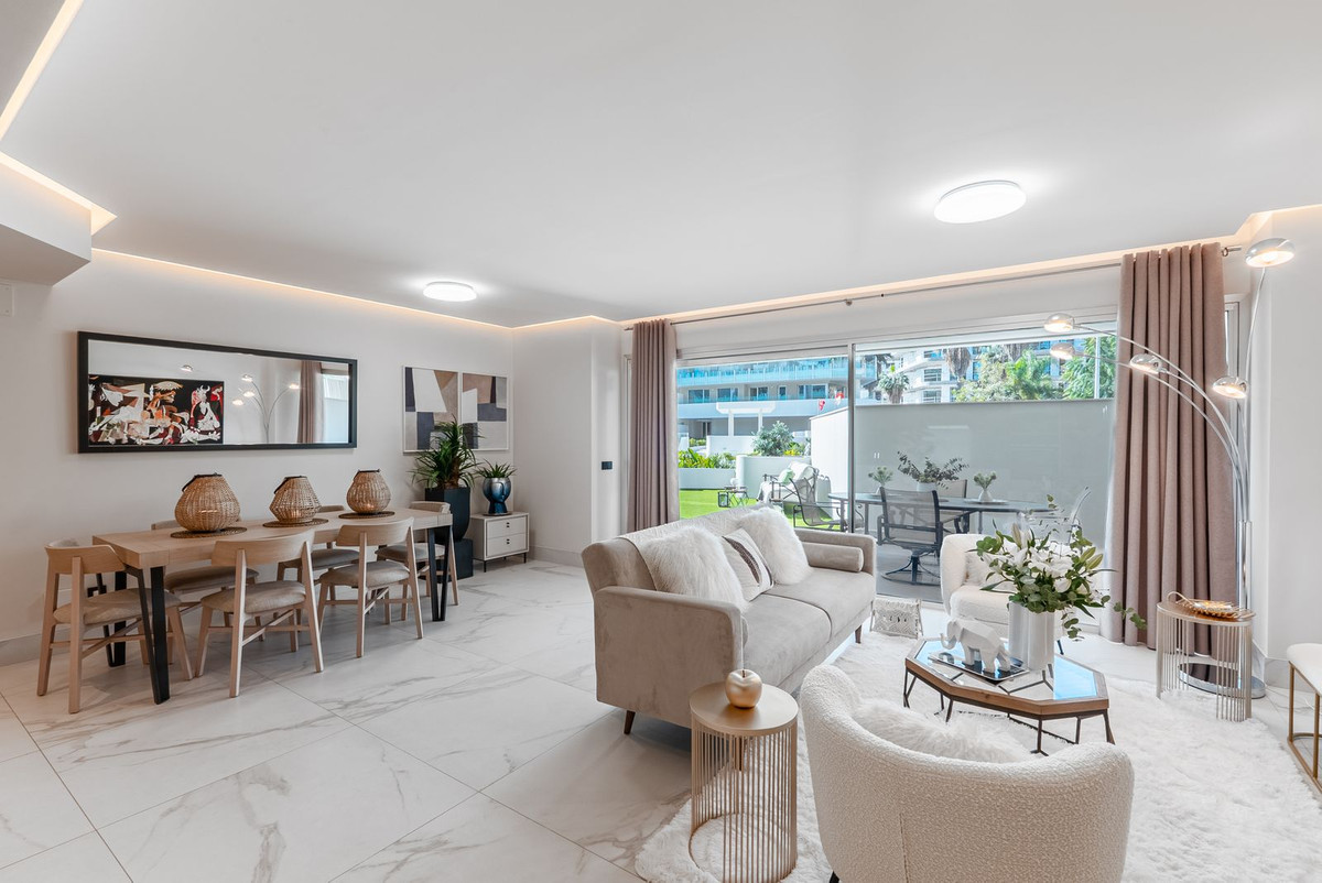 This elegant 2-bedroom, 2-bathroom ground-floor apartment is located in one of the most desirable areas of the Costa del Sol, just steps from the beach and all essential amenities. Designed for comfort, style, and convenience, this home offers a perfect blend of indoor and outdoor living thanks to its spacious private garden and generous covered terrace. With high-quality finishes throughout, the apartment features a bright open-plan living area, a fully fitted kitchen, and two well-proportioned bedrooms with fitted wardrobes. Large glass doors connect the interior with the outdoor spaces, creating a natural flow ideal for relaxation or entertaining. Set within a contemporary gated community with beautifully maintained gardens and a communal swimming pool, the property also includes private garage parking for one car and additional storage. With amenities, shops, restaurants, schools, playgrounds, and transport links all within walking distance, this home is perfectly positioned for both full-time living and holiday use. Whether as a primary residence or a premium investment opportunity, this apartment stands out for its excellent condition, prime beachside location, and rare combination of private garden and modern design.