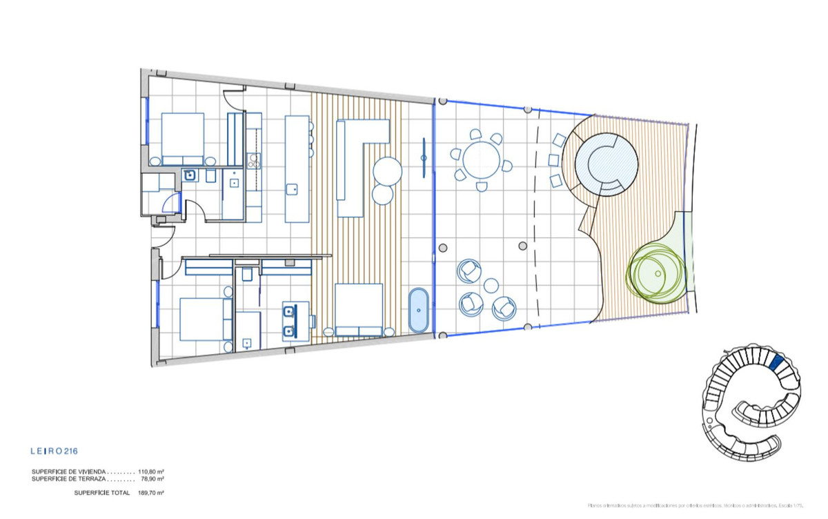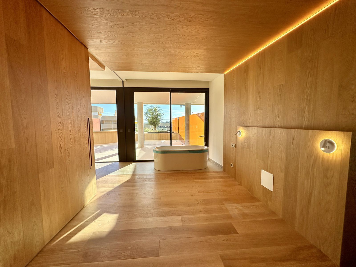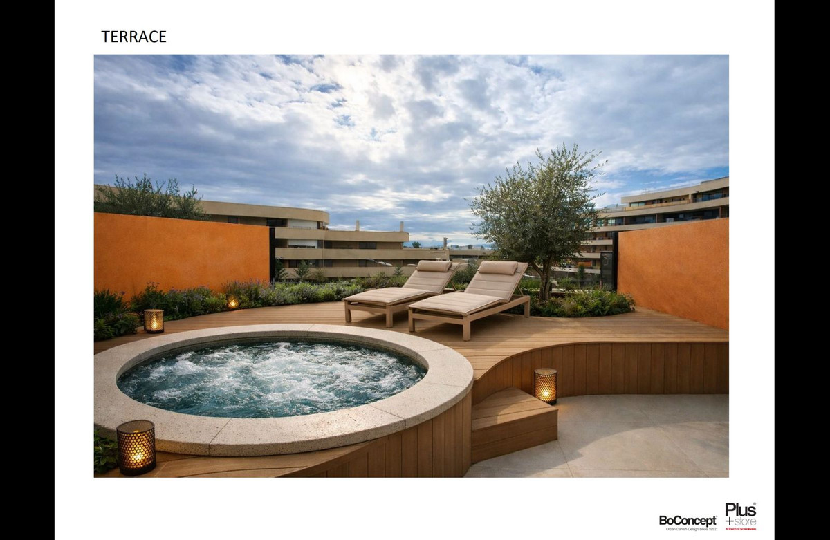 Exclusive apartment villa located in the prestigious South Residences, Higuerón Resort in Fuengirola, offering a refined balance of contemporary design, privacy, and resort-style living on the Costa del Sol. This distinctive 3-bedroom apartment villa enjoys a calm, light-filled atmosphere and spacious open-plan interiors designed for both comfort and elegance, with premium finishes throughout. The living room connects seamlessly to the main bedroom via an elegant sliding glass wall, allowing the space to be fully opened for a generous, modern feel or closed for intimacy when desired. Sliding wall between living room & master bedroom make the living room more spacious. Very bright and sunny. The extended living area flows naturally towards a side terrace with full-height glass, offering open Mediterranean views from multiple angles and creating an exceptional indoor–outdoor living experience. Rich wooden floors combined with natural wood detailing on walls and ceilings add warmth, texture, and a refined architectural character throughout the home. Outdoors, a private jacuzzi provides an intimate sanctuary for relaxation, day or night. Residents benefit from exclusive on-site amenities, including sauna, coworking space, and multiple swimming pools, while the full range of Higuerón Resort facilities is just a 2-minute walk away, offering spa, sports club, fine dining, beach club, and concierge services. Ideal as a permanent residence, second home, or high-end investment, this property represents a rare opportunity within one of the most sought-after gated communities on the Costa del Sol. Optional fully furnished package available, featuring top-quality designer furniture. The buyer may personally select the furniture directly from BoConcept, ensuring a fully customized, turnkey home.