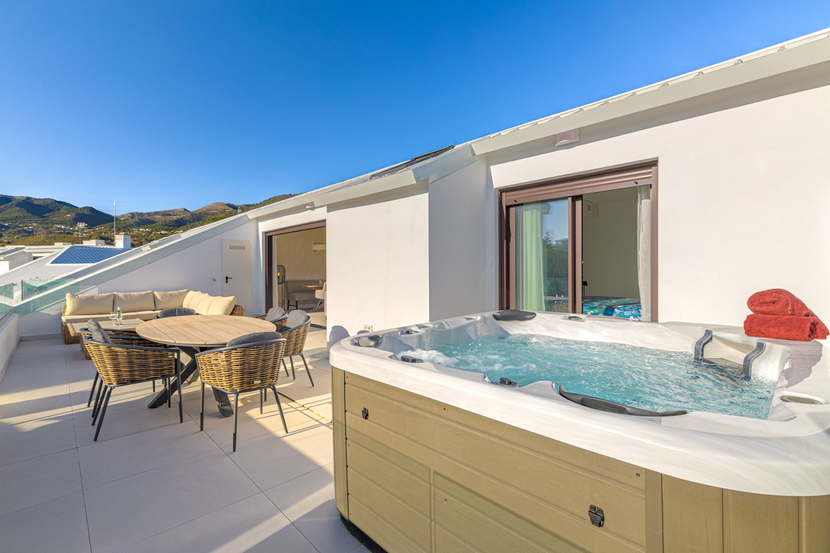 Discover this exceptional southwest-facing penthouse in the exclusive Lomas del Higuerón, one of the most prestigious residential enclaves on the Costa del Sol, renowned for its privacy, security, and elevated lifestyle. This elegant property offers 2 spacious bedrooms and 2 beautifully designed modern bathrooms, created with comfort and refined contemporary living in mind. The bright open-plan living space is flooded with natural light and flows seamlessly onto an impressive 50 m² private terrace, undoubtedly one of the home’s standout features. Here, you will find a luxurious jacuzzi, creating the perfect setting to unwind while enjoying breathtaking sunsets and partial sea views thanks to its privileged southwest orientation. The property includes a private parking space and a storage room, ensuring both convenience and practicality. Residents of Lomas del Higuerón benefit from access to an exclusive lifestyle, with proximity to the renowned Higuerón Resort, offering world-class amenities such as a state-of-the-art sports club, spa and wellness center, Michelin-starred dining, and 24-hour security. The area is surrounded by nature yet perfectly connected, just minutes from the beach, the train station, and with direct access to Málaga Airport, Marbella and Fuengirola. Combining sophisticated design, premium outdoor living, and a highly desirable location, this penthouse represents a unique opportunity both as a luxurious permanent residence and as a high-end investment on the Costa del Sol.
